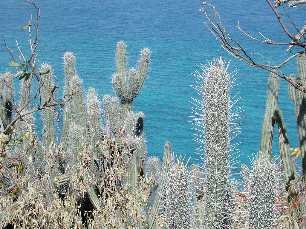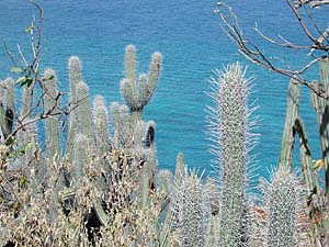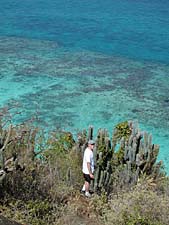 Rick kept jumping from one rock to another, hoping for a glimpse of a shark, but they seemed to be hiding. We decided that the view was well worth the trip, even without any sharks. It was great to be up so high, all by ourselves. There were a huge number of cacti up on top of the island. Click here to view even more. Afterwards we went around the island in the boat, looking at the reefs up close. Then back to the resort for lunch. We both decided that we're not going to eat for two weeks after we get home!